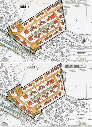 Es lagen zwei Varianten der Planungsgruppe Strunz vor, die sich hauptsächlich in der Verkehrslösung am Knotenpunkt zwischen Angerstraße, Hergeten und Zufahrt zur Ebinger Straße unterschieden, wo 4 Straßenarme aufeinander stoßen werden. Während die eine Variante an dieser Stelle einen kleinen Kreisverkehr vorsah (à siehe Bild 1), löste die andere Variante diesen Verkehrsbereich mit einem „Shared Space“ (à siehe Bild 2).Ein derartiger „Shared Space“ basiert auf der Idee einer verkehrsberuhigten Zone, in der auf Verkehrszeichen verzichtet wird, wobei alle Verkehrsteilnehmer vollständig gleichberechtigt sind und die Vorfahrtsregel „rechts vor links“ natürlich weiterhin gilt.