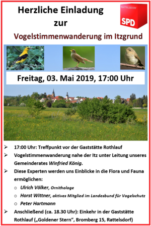 Im Rahmen des Formats SPD-Umweltwanderung lädt der SPD-Ortsverein Rattelsdorf und die SPD Bamberger Land alle Bürgerinnen und Bürger ein zur Vogelstimmenwanderung im Itzgrund.