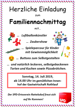Auch in diesem Jahr lädt der SPD-Ortsverein Rattelsdorf wieder herzlich zum Familiennachmittag ein.